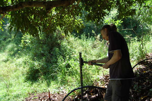 Jamie burries the metal stake.After burrying the stake a good half metre into the ground Jamie hits a rock - the spike wont go in any further and as it's in solid we decide to cut the excess with a hacksaw. Easier said than done!
